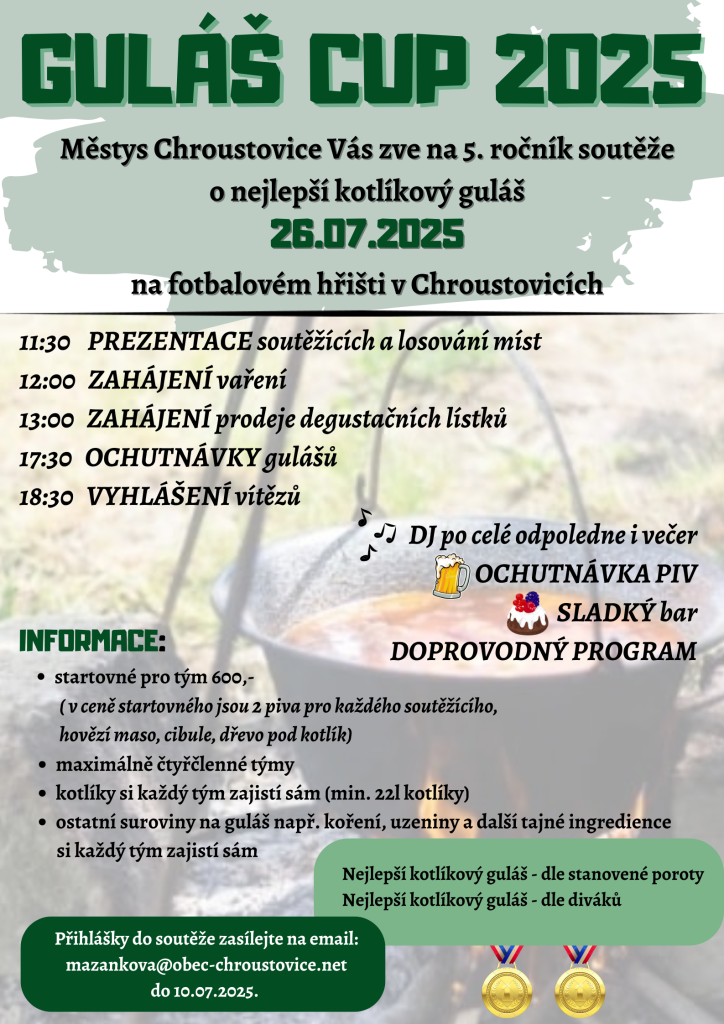 Městys Chroustovice pořádá 5. ročník Guláš Cupu, soutěže o nejlepší kotlíkový guláš, která se uskuteční 26. července 2025 na fotbalovém hřišti. Prezentace soutěžících začne v 11:30, vaření od 12:00 a ochutnávky gulášů od 17:30. Těšit se můžete na skvělou atmosféru s DJ a degustačními lístky. Týmy se mohou přihlásit do 10. července 2025 a startovné činí 600 Kč.